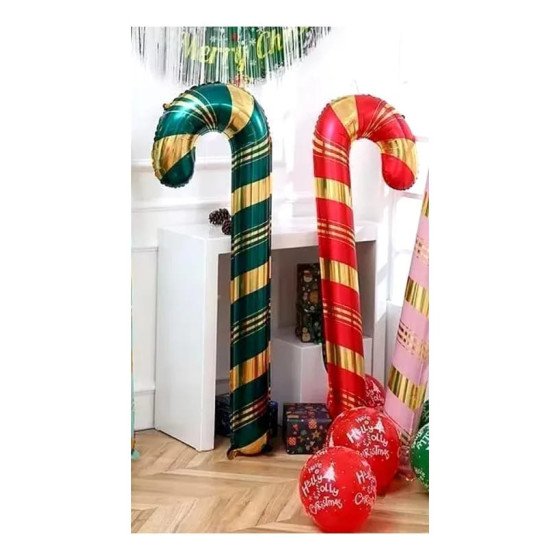 36cm x 20cm. Globo metalizado de Bastón de Caramelo Navideño. Se pueden inflar con aire o con helio.