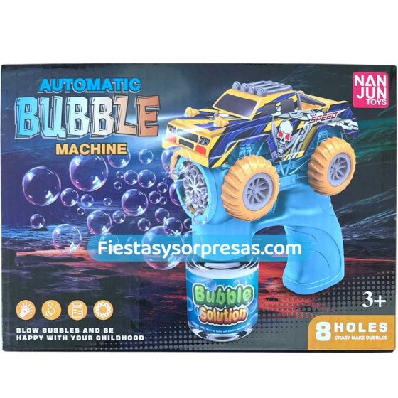 Pistola automática de burbujas. 8 agujeros. Funciona con 2 baterías AA (no incluidas). +3 años. Tamaño: 13cm x 16.5cm.