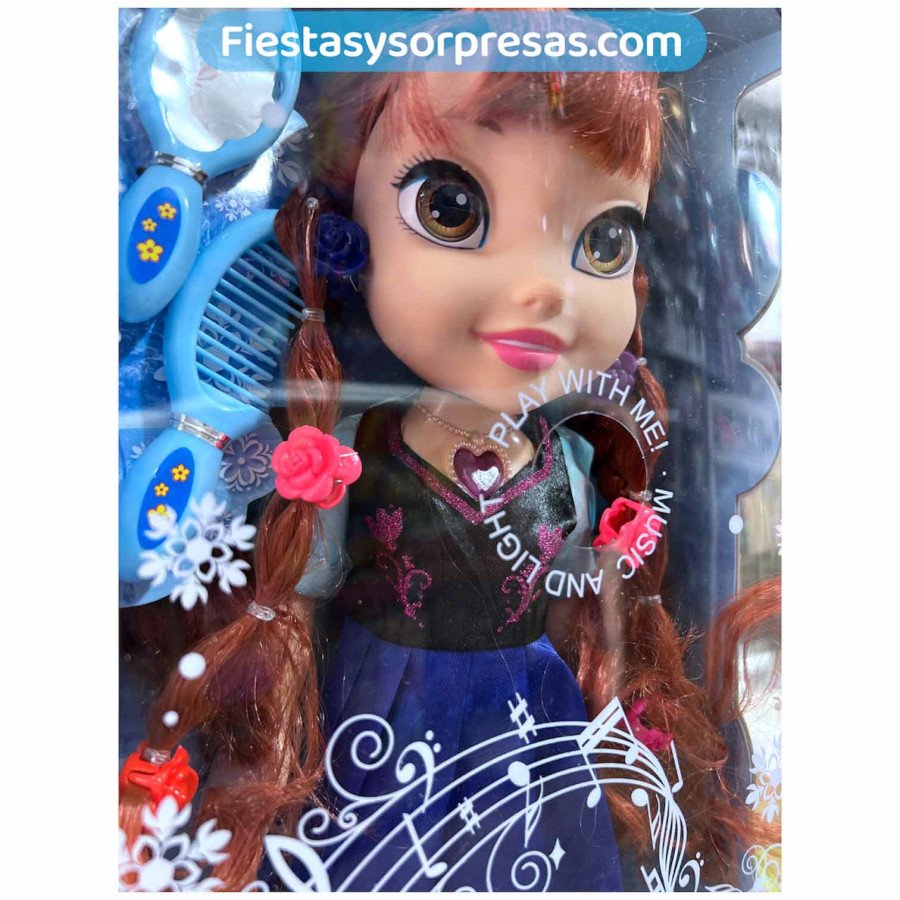 Muñeca musical Ana de Frozen, canta e ilumina. Contiene: espejo y peine. Tamaño: 19cm x 37.5cm. +3 años. Baterías no incluidas.